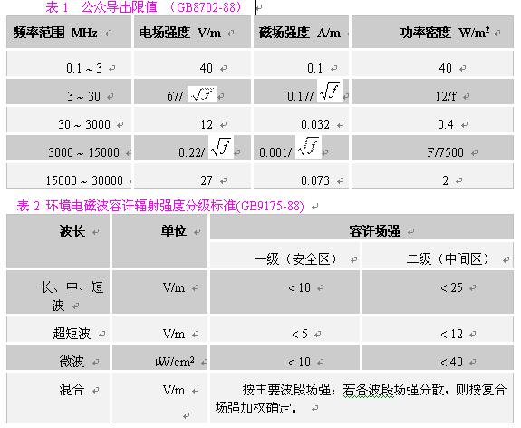 在對一般環(huán)境的電磁輻射分析中,應主要選用《環(huán)境電磁波衛(wèi)生標準》主要選用《環(huán)境電磁波衛(wèi)生標準》(GB9175-88),根據輻射源的主要輻射頻率,參照表2,找到其輻射強度限值。注意掌握三個標準限值,一般我們把居民居住的環(huán)境按一級安全區(qū)處理,則其標準限值為:在長、中、短波,電場強度應小于10V/m;在超短波段,電場強度應小于5V/m;在微波波段,其輻射功率密度應小于10μW/cm2。考慮到對在電磁輻射環(huán)境內工作人員的保護,我們建議在職業(yè)安全衛(wèi)生領域,采用《電磁輻射防護規(guī)定》(GB8702-88)的相應限值。