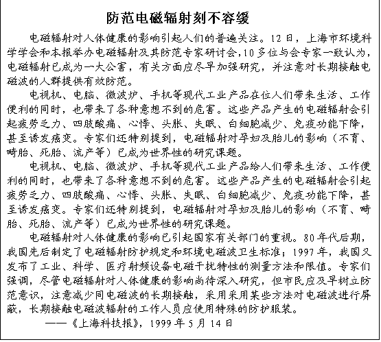 我們希望政府及有關(guān)職能部門采取切實(shí)措施,組織一些有關(guān)電磁知識的宣傳活動,讓人們在利用電磁波的同時清醒的意識到電磁波的危害,增強(qiáng)自我防護(hù)意識。如果需要,我們中學(xué)生愿意成為電磁輻射的義務(wù)宣傳員。具體措施如下: